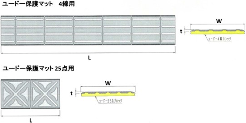 ・視覚障害者誘導用ブロック専用のゴム製保護マットで、ブロック設置工事およびその周辺工事中、ブロック表面の汚れ・割れ・カケなどを防止しする。