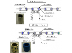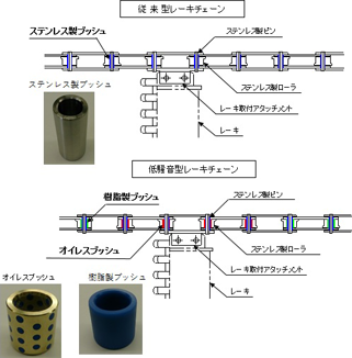 ・レーキチェーンのローラにおいて、ステンレス製ローラの摺動部にオイレスブッシュと樹脂製ブッシュを採用した。