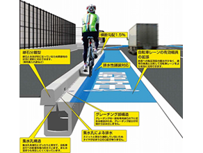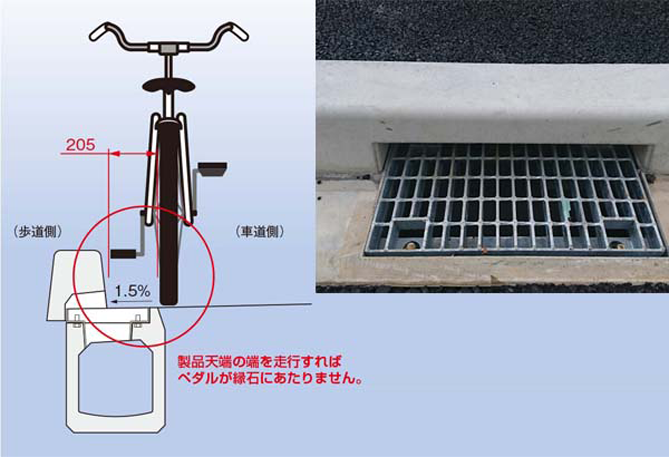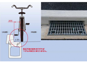 ・集水孔が縁石際にあるので、水溜りができにくく、自転車の車輪や杖、ヒール等が嵌る恐れが少ない。