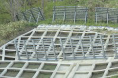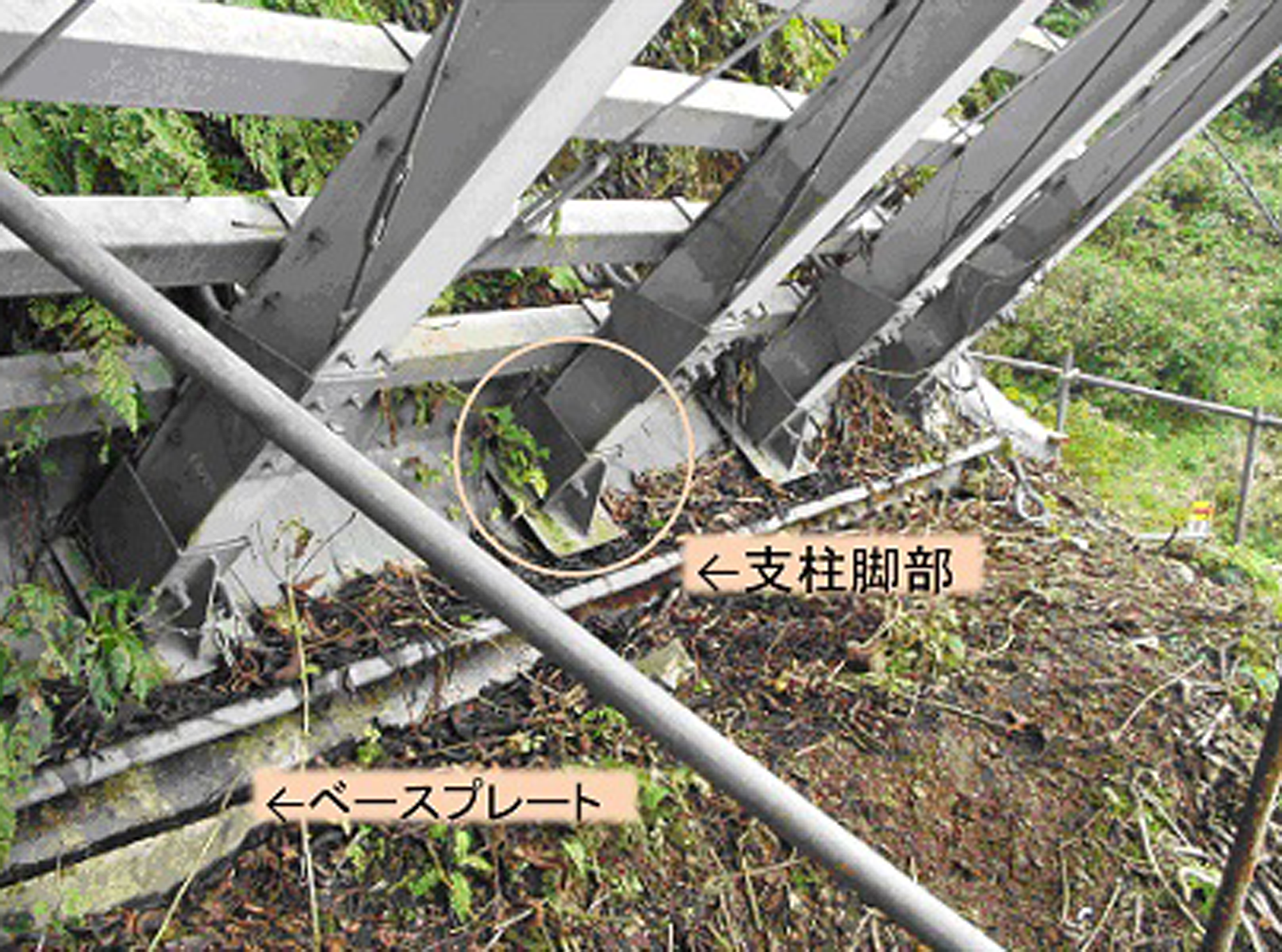 ・沈降力に対応するため支柱に設置されていた従来のサポート材をなくし、新たに支柱脚部にソールプレートを取り付け斜面上に設置したベースプレートとの接点を回転構造にし、沈降力に対応させる構造としたため構造物としての品質が高まった。