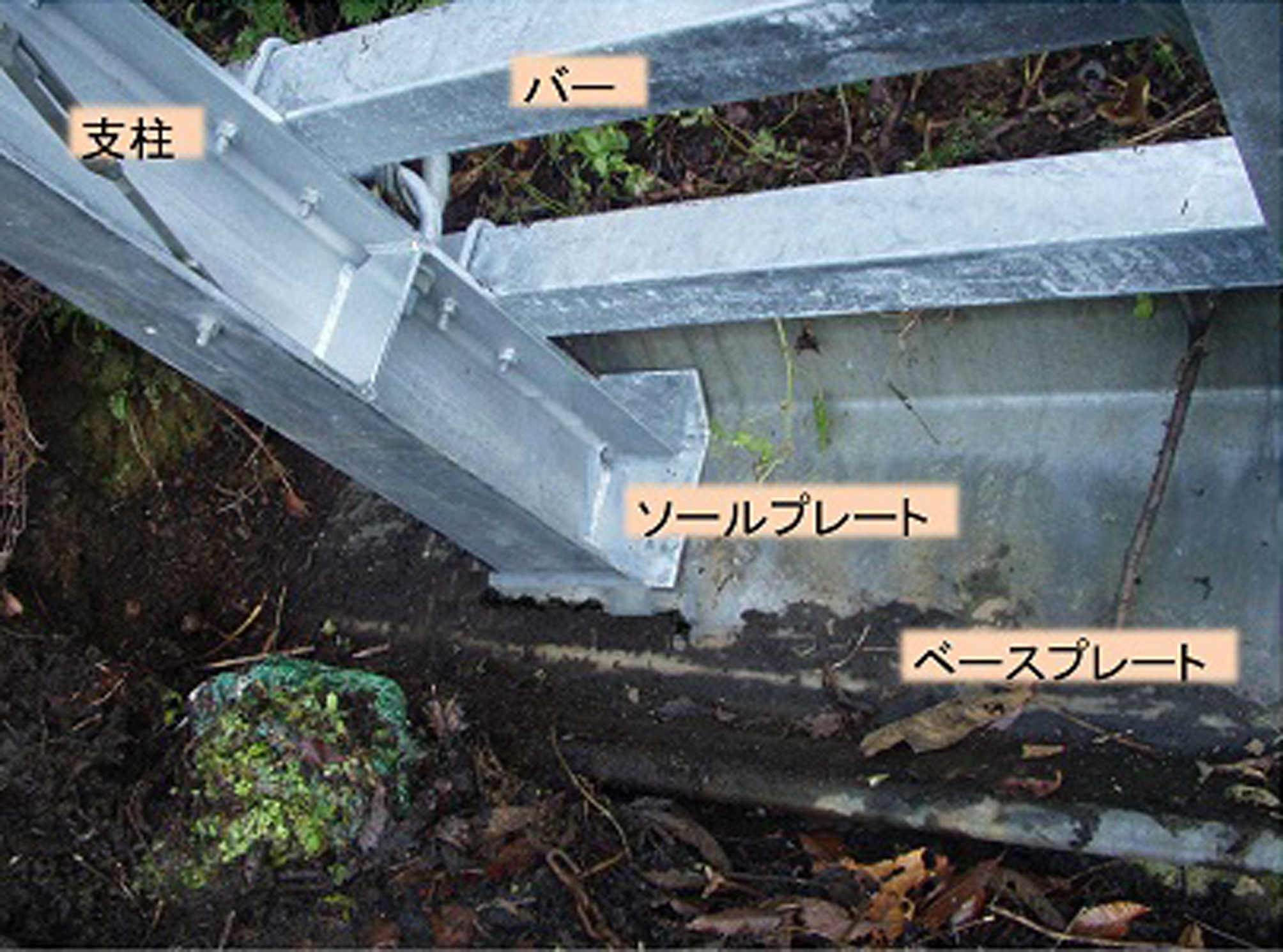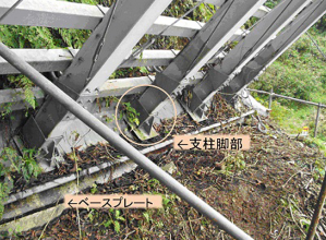 ・支柱脚部にソールプレートを取り付けベースプレートを介して斜面に設置する構造とし、支柱脚部をヒンジ構造とした。