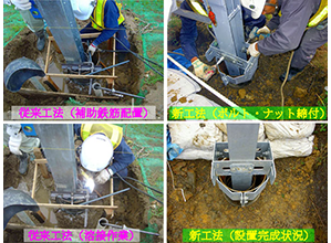 現在、高規格道路及び広幅員道路において、杭基礎に鋼管杭を使用し、 防雪柵工・防風柵工・標識工等の主柱材を鋼管杭内に建込み施工を行うときの方法として、鋼管杭を打ち込み後、補助鉄筋により主柱材[H鋼材等]を間接的に鋼管杭内に溶接することにより仮固定し、コンクリート打設し接合していたが、