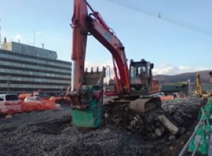 ・従来は、施工単価や発生材の一時仮置き場、施工面積の確保等の問題により骨材再生工(自走式)を選択できずダンプトラックで中間処理施設等へ搬出し、現場で使用する骨材は購入し施工していた。本技術は、コンクリート塊(有筋・無筋)を様々な工事現場内で簡易に再生骨材とし利用できる様、再生骨材を製造する主体機械をバックホウ(山積0.8m3)とし、再生骨材製造機をバックホウバケット部への脱着式(アタッチメント)とした。これによりバックホウ1台で集積・骨材製造作業、請負者の直接作業などバックホウの特性(機動性、操作性)を生かした施工ができ、多種多様な条件下でコンクリート塊の現場内利用が可能となっている。