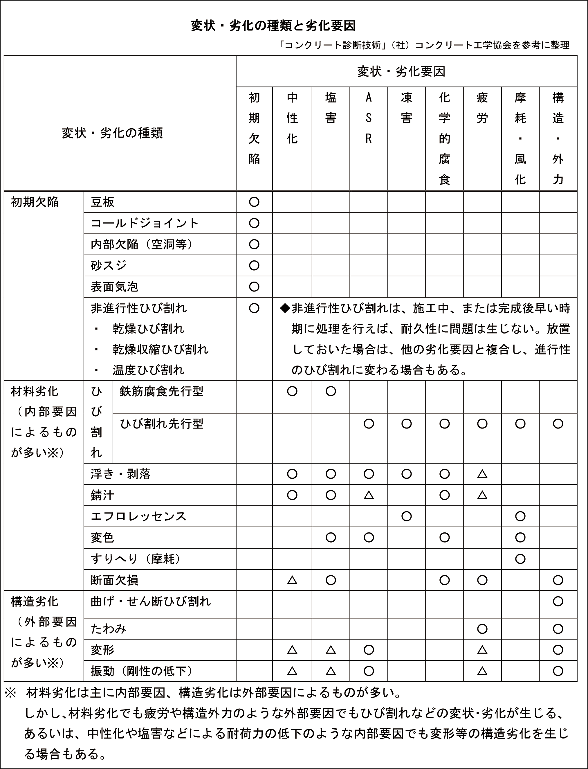 劣化現象 施工による不具合と劣化現象 コンクリートは丈夫で耐久性があり、しかも自由な形状にできる。多くの構造物に用いられてきている代表的な建設材料である。