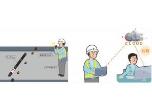 舗装出来形を専用デジカメ(画素数1200万画素以上)を使って一人で高精度に検測ができ、帳票を自動作成できるシステム。