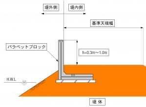 堤防の盛土の際に堤防天端の幅員を必要幅確保するための、パラペット構造の特殊堤をプレキャストブロックとして製品化したもの。 パラペット構造の特殊堤とは大雨や風浪などで河川が計画高水位を越したときの越流水を防ぐ目的の堤防の嵩上げを目的としている。