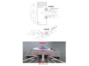 ダム貯水池や湖沼に設置されたガイドレールに浮桟橋を係留し、水位の上下動に追従させる装置。