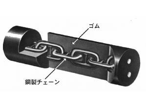 本技術は鋼製チェーンをゴム材で被覆した製品を、港湾・海洋・湖沼・ダム・河川等の水域で用いられる浮体構造物の係留索に使用するものであり、従来の被覆のない鋼製チェーンと比較して、耐腐食性や耐摩耗性(リンク間の摩耗や地面との摩耗)が向上すると共に、本体が伸びる事で(伸び率3%確保)衝撃力の緩和、ねじれ防止効果などによる長寿命化を図る。