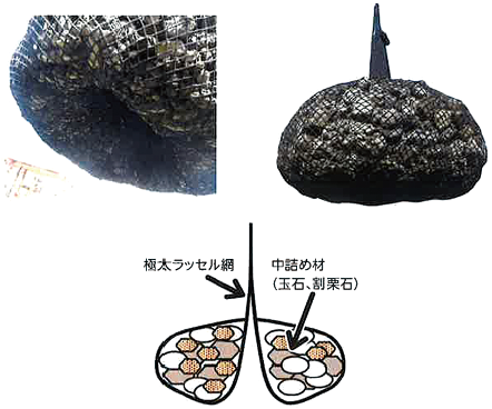 ナカダ産業株式会社 底部吊上げ構造(=ボトムリフト構造)を有した袋詰玉石工「ロックユニット」。自重により中詰め材を拘束(Lock)し、一つの岩(Rock)のようにできる。