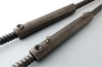 第一高周波工業株式会社 DHFが清水建設株式会社と共同で開発した新技術で、高周波誘導加熱により鉄筋母材自体を熱間加工することで鉄筋端部に拡径部を設け、機械的にコンクリートに定着させる工法である。