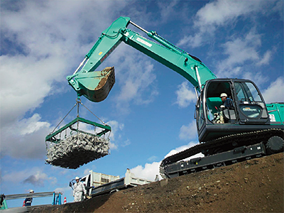 ボックストーン工法とは従来技術の人力主体の現場施工を石詰め器具と重機を主体とした施工方法への変換を図り、現況就労者の少ない熟練工への依存度を縮減するものである。