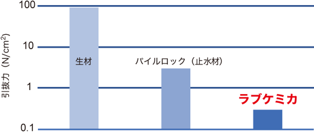 試験の結果を単位面積当たりの引抜き力としてグラフ化した。グラフより無塗布品のフラットバーの引抜き力を比較対象として見ると、パイルロック塗布品で1桁の低減が得られ、ラブケミカ塗布品でさらに1桁の低減を得られた。また、実施工事においても良好なる引抜き力低減効果が確認されている。