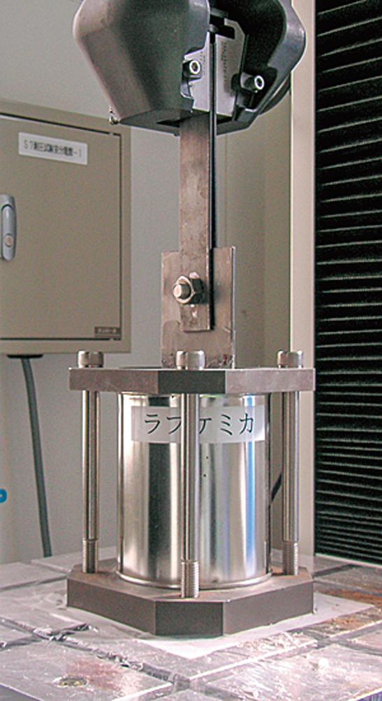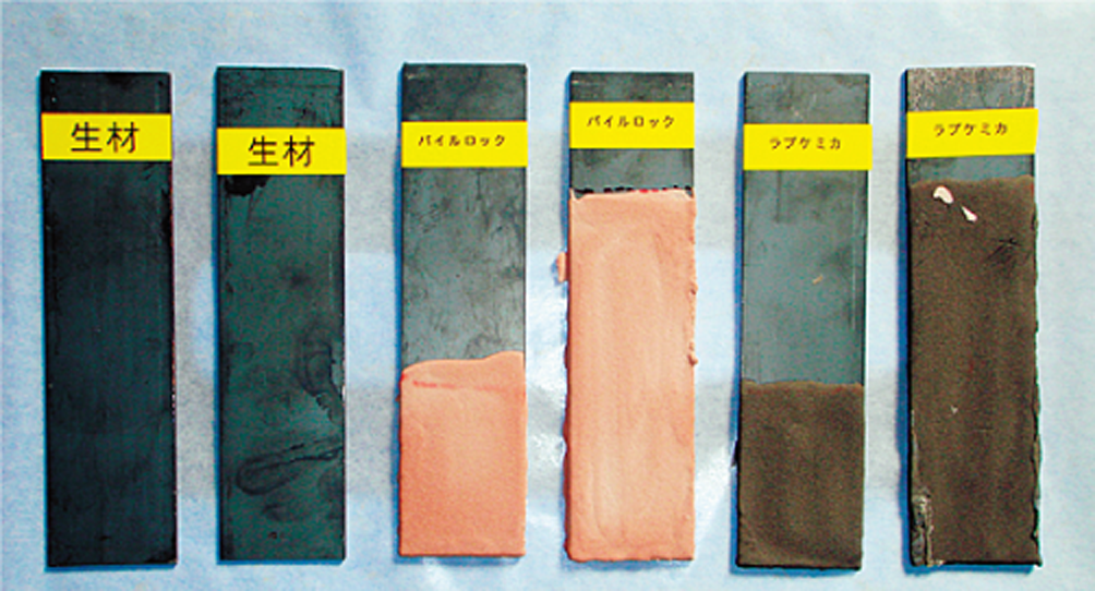 モルタル躯体にラブケミカ、パイルロック(日本化学塗料(株)の止水材)塗布と無塗布のフラットバーを埋設し、オートグラフで引張り引抜き強度を比較した。