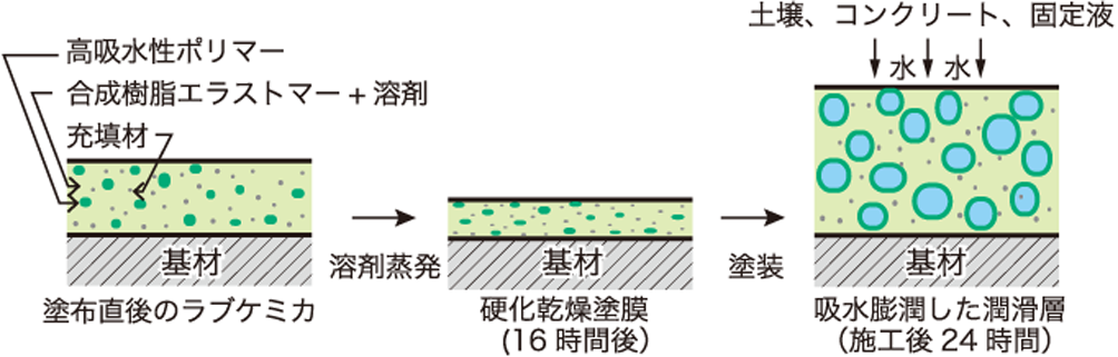 ラブケミカは日本化学塗料(株)が開発した、摩擦力低減材である。ラブケミカをH鋼、鋼矢板、基礎杭などにあらかじめ塗布・乾燥して施工すると、塗膜が地中の水分や周辺固定液を吸収して膨潤体を形成する。この膨潤体が潤滑層として働き、被塗物表面にかかる摩擦(フリクション)を著しく低減(リデュース)させる。NETIS登録番号はKT-100002-A(旧登録)である。