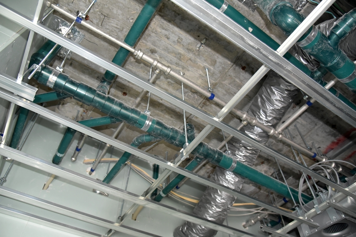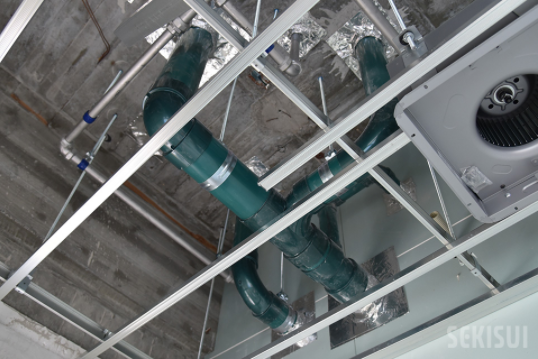 天井配管や吊り配管ではパイプを持ちあげる必要があるが、耐火VPパイプをはじめ、樹脂