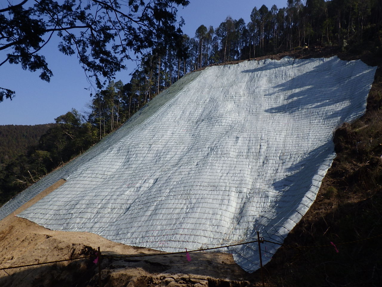 数年前の災害により崩れた山の斜面の復旧工事。