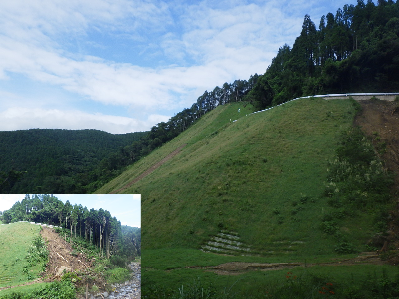 は豪雨に耐え、法面保護及び緑化を維持することができた。
