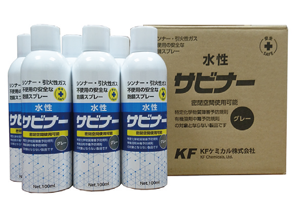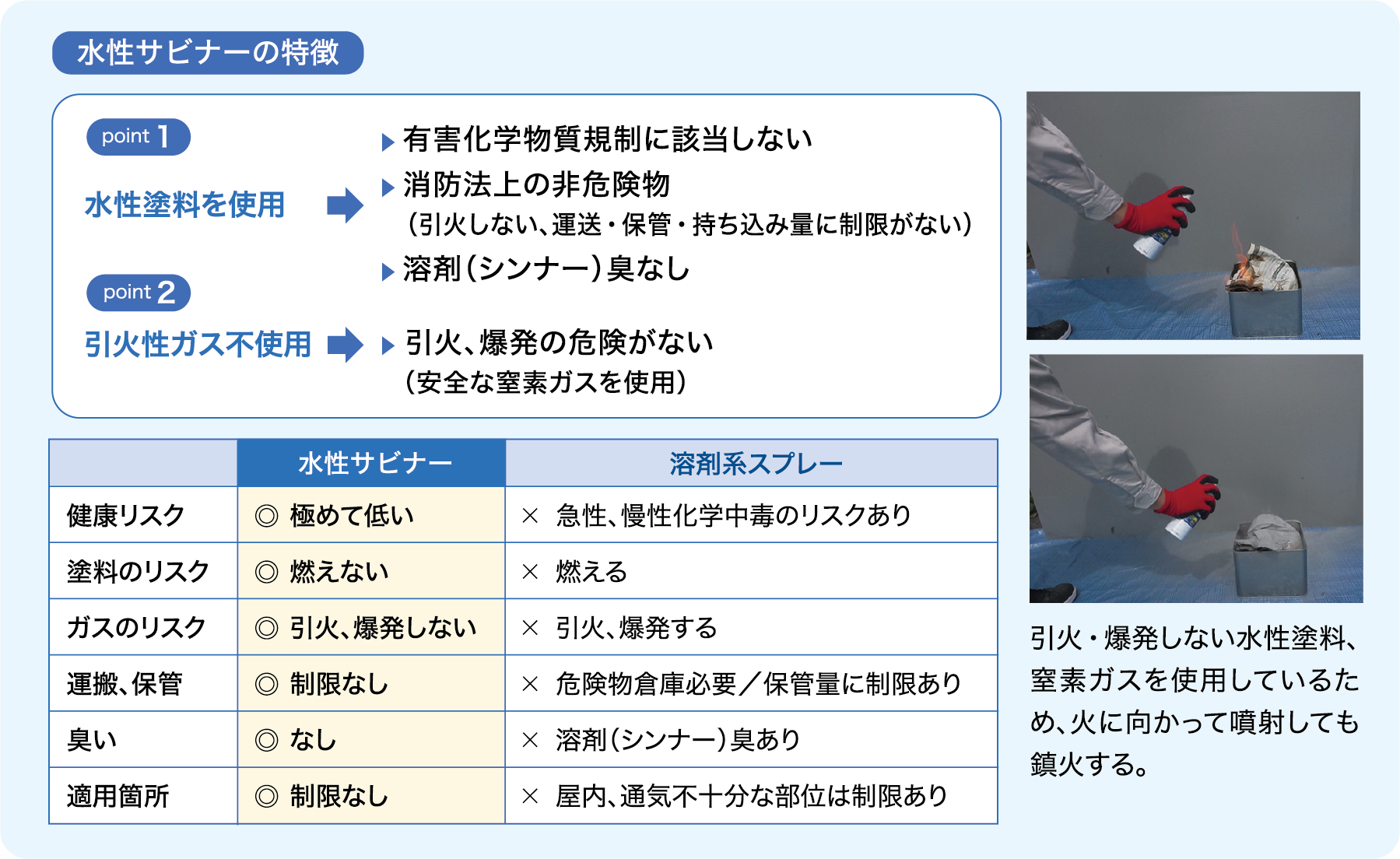 一般的に噴射剤として用いられるDME・LPGは、引火や爆発の危険性がある。水性サビナーは引火、爆発の危険がない窒素ガスを用いており、安全性が高い。内容塗料、内容ガス両方が引火しない仕様のため、火に向かって噴射しても鎮火する。