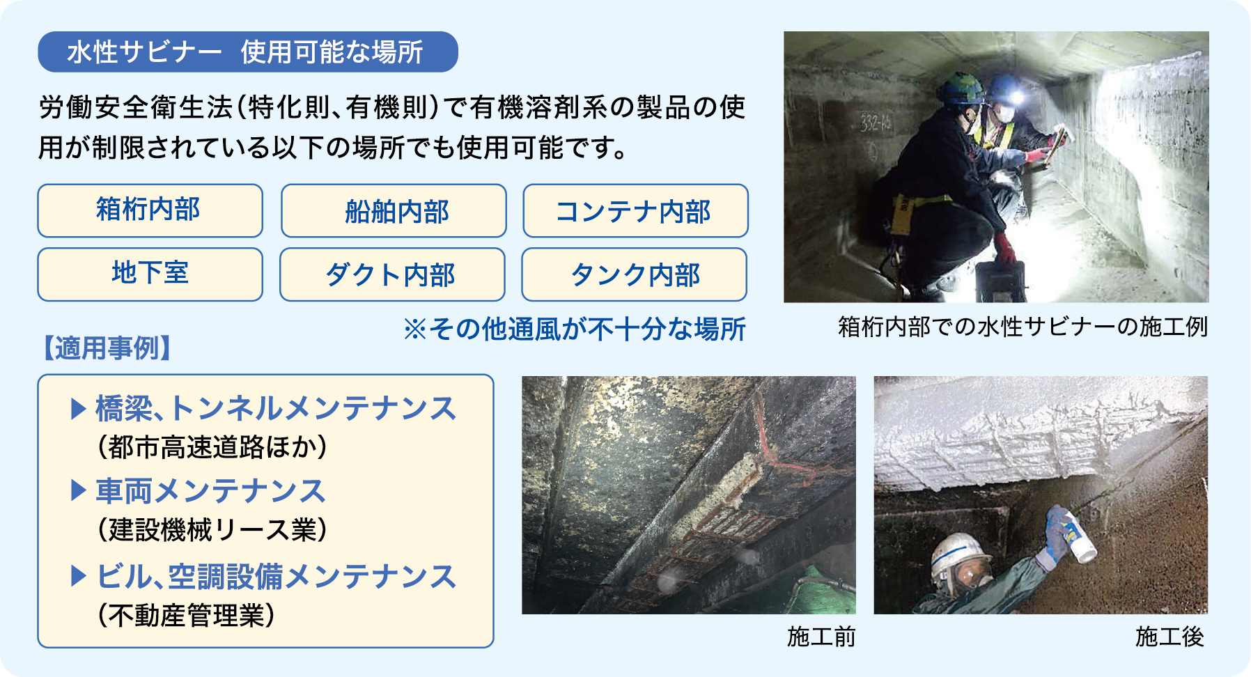 このように水性サビナーは、使用が規制されていた密閉空間でも使えるため、すでに首都高速道路における構造物点検、東京都建設局の橋梁メンテナンス等の現場で、防錆の応急措置として利用が進んでいる。また臭いがないことから、医療施設の空調保守点検等、密閉空間以外の場所でも重宝されている。