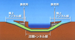 一方、異なる施工法によって建設されるのが沈埋トンネルだ。掘削して掘り進んでいくことはしない。河川や海峡を横断する道路などの建設に採用されている。あらかじめ水底をルートに沿って溝状に掘っておき、地上で製作した沈埋函(ボックスカルバート)を沈め、これを接続してトンネルにする。東京湾周辺の首都高速道路の建設で多く採用された。