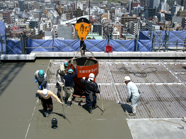 打設したコンクリートは、バイブレーターで締め固め、ジャンカなどと呼ばれる不具合の発生を防ぐ。大量のコンクリートを一気にしかも確実に施工する。これによって、高品質で耐久性の高いコンクリート構造物ができる。製造過程での品質管理はもちろんだが、現場での短時間の勝負によって品質が左右されることになるのである。