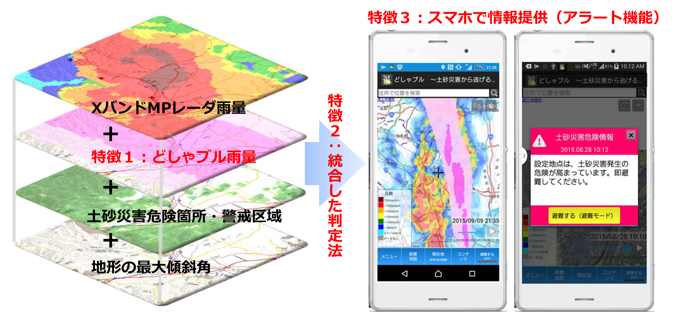 総合的な土砂災害危険度判定法に加えて、アラート通知で避難行動を支援するスマホ用のアプリを開発した。