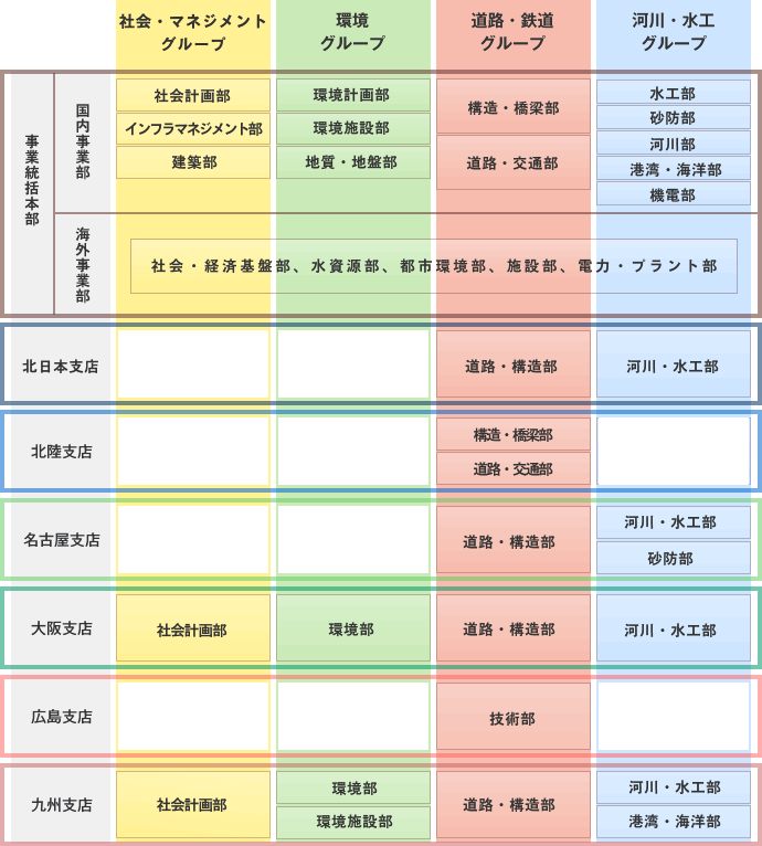 この幅広い分野に取り組むことのできる強みを活かし、従来の事業部制の縦ライン組織を、「社会・マネジメント」「環境」「道路・鉄道」「河川・水工」の四つの部門別グループと、「研究開発」「海外事業」による横断的組織で束ね、縦横のマトリックス組織を形成することにより、総合力の発揮を目指している。
