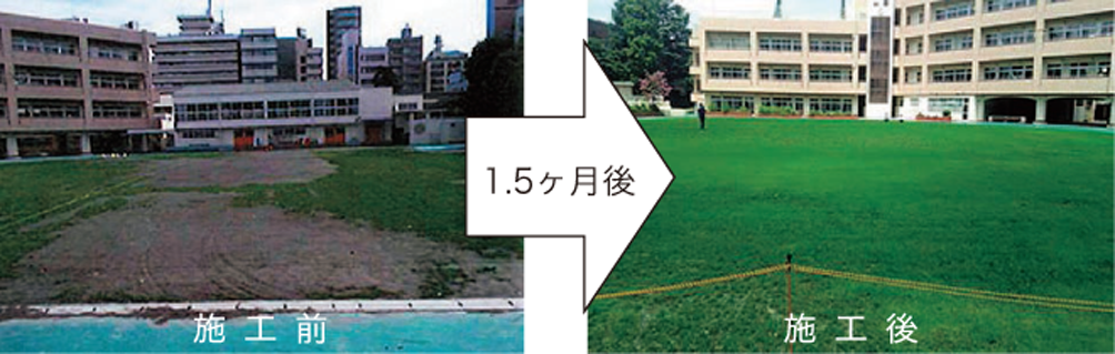 防草目的で適用されていたグリーンサンドに対し、DW ファイバーを土壌に混合し、ティフトン植栽による芝生化に成功した。