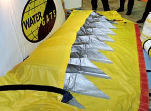 ウォーター・ゲートは、多くの人手と手間を要する土のうに代わる、画期的な止水シートである。従来、高さ50cm・長さ10mの土のうを設置するには約450個の土のうが必要であったが、 ウォーター・ゲートなら一人で持ち運びが可能で、しかも2分で設置ができる(FPシリーズ)。更に10秒程度で設置が可能なFLシリーズもある。