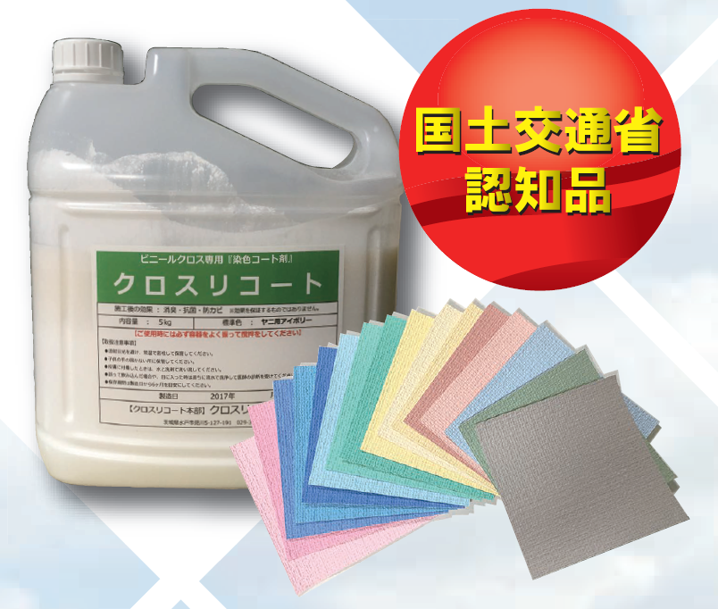 抗菌力・消臭力の高い染料を使用することにより、菌やウイルスなどをクロスリコート施工した壁紙が自ら除菌し、またペット臭やタバコの臭いも同様に吸着分解する、人に優しいクロス再生技術である。
