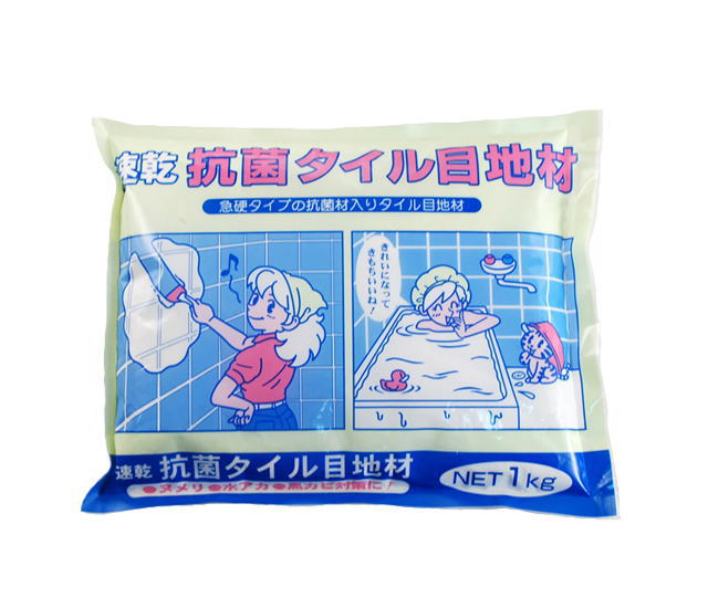 抗菌性を持った速乾性のタイル目地材。銀系抗菌剤は抗菌活性に選択性があり、カビには効果が低い欠点があるが、本品はほとんど全ての細菌とカビに有効であり、紫外線や塩素による劣化もない。