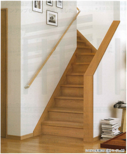 シンプルなデザインの階段部材。施工後に取外し可能な着脱機能付き金具部材もラインアップ。抗菌塗装済。