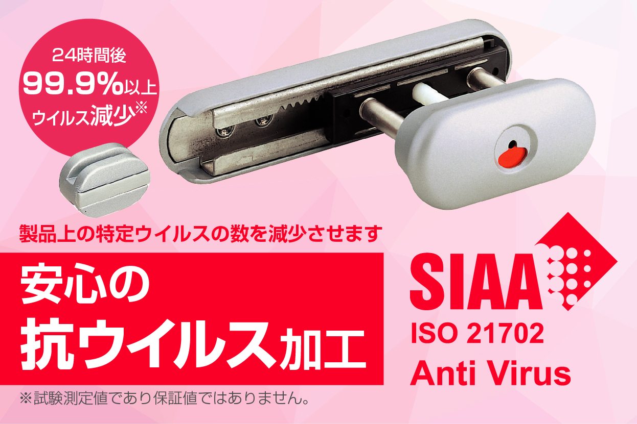 トイレ空間において必ず触れる手で触れる錠前の金物に、製品上の特定ウイルスの数を減少させる抗ウイルス加工を施した、SIAA認定を取得した安心の製品である。