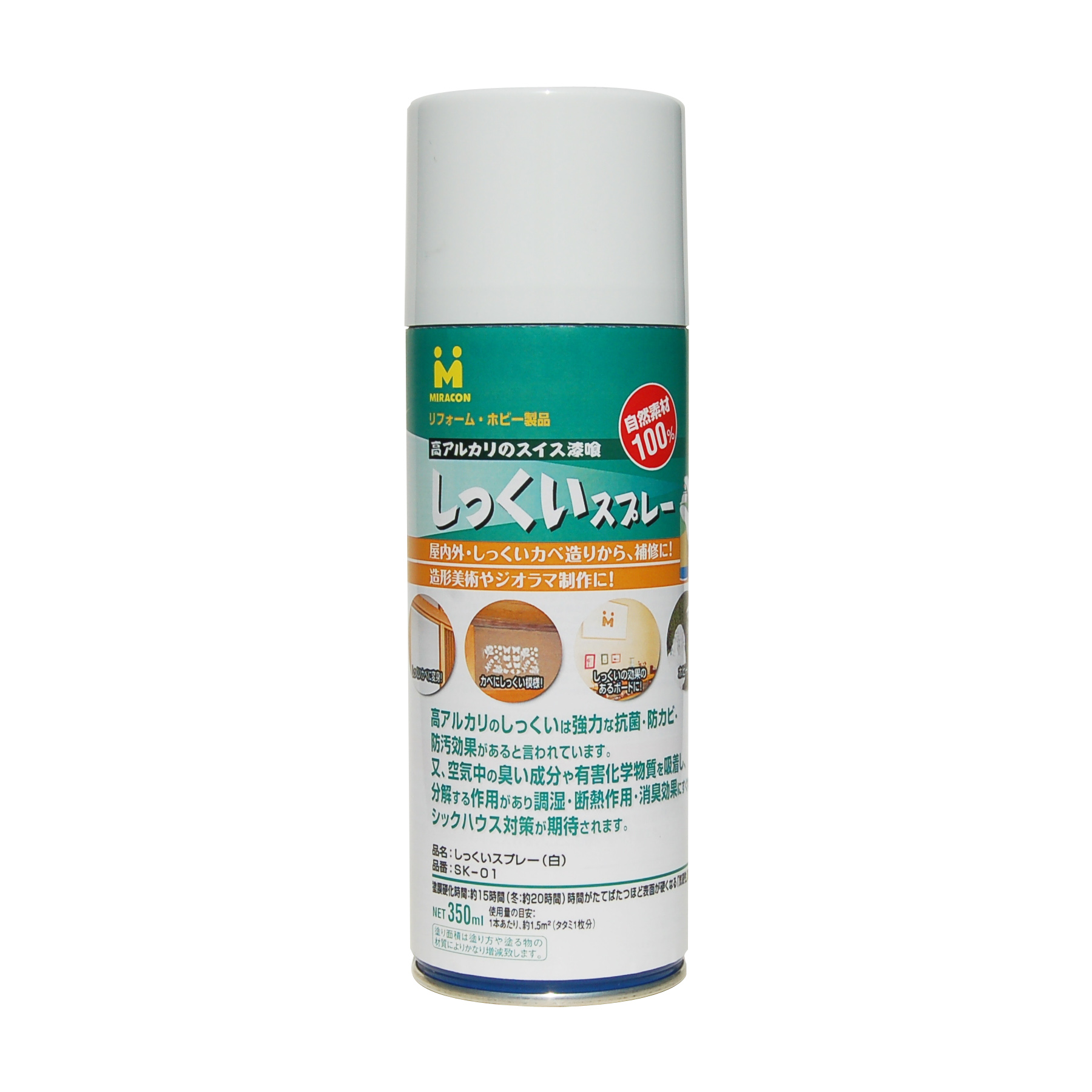 高アルカリのスイスのしっくい塗料。スプレーするだけで、しっくい壁の補修・塗り替えから、ホビーまで用途は様々。