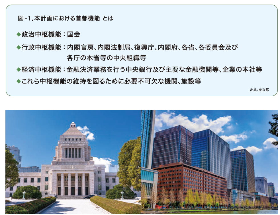 東京は日本の約1割の人口を占め、多様な産業、情報、交通網、大学・研究機関などが集中する世界有数の大都市です。政治や行政、経済の中枢として、国会や中央省庁をはじめとした各機関が集まり、首都機能(図-1)を担う日本の心臓といえます。