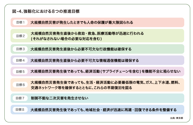 この4つの基本目標をより具体化し、「8 つの推進目標」(図-4)を設定しています。都民の生活・経済に影響を及ぼすリスクとしては、大規模事故など、自然災害の他にも想定されますが、首都直下地震や南海トラフ地震等の発生予測、気候変動に伴う台風の巨大化や短時間豪雨の増加傾向など、大規模自然災害は多様で、広範囲に甚大な被害をもたらす可能性があるため、8つの推進目標の設定は、大規模自然災害に限定しています。