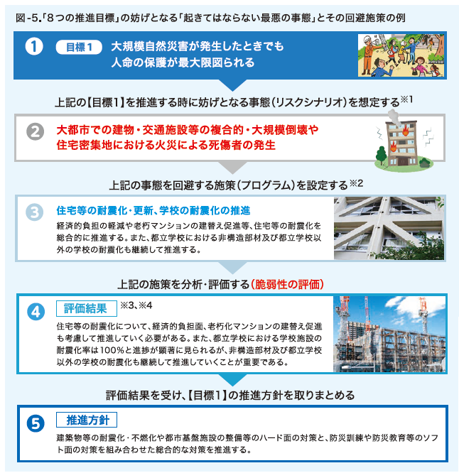 前ページの「8つの推進目標」の達成を計画する際に、逆に目標達成を妨げてしまう事態(リスクシナリオ) を想定し、どうすればその事態を避けられるかを考えます。目標達成を妨げる事態を「起きてはならない最悪の事態」、それを回避する施策を「プログラム」としています。たとえば、【目標1】では「大規模自然災害が発生したときでも人命の保護が最大限図られる」(図-5 ①)という目標を妨げるものとして、「大都市での建物・交通施設等の複合的・大規模倒壊や住宅密集地における火災による死傷者の発生」(図-5 ②)という事態を想定します。さらにこのような事態を起こさないための方策として「住宅等の耐震化・更新、学校の耐震化の推進」(図-5 ③)というプログラムが組まれています。この「プログラム」を実施するにあたり、「起きてはならない最悪の事態」の回避が可能か否か判断し、不可能である場合に何が足りないかを分析します。そして、現状を改善するために何が課題であり、今後どのような施策を導入するべきかについて分析・整理を行います。上記の分析を基に、現状の脆弱性を総合的に分析・評価しています(図-5 ④)。この評価結果を受け、【目標1】を達成するための推進方針としています(図-5 ⑤)。国土強靭化に取り組む事業については、一覧を東京都防災ホームページに掲載しています。また、このたび、東京都では、都民の安全・安心を確保できる、強靭で持続可能な都市の実現を目指し、「『都市強靭化プロジェクト(仮称)』の策定に向けた論点」を新たに取りまとめました。こちらについては東京都政策企画局のホームページに掲載しております。