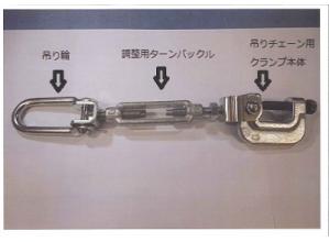 (一社)仮設工業会の認定品目である吊りチェーン用クランプに、ターンバックルを組み込むことにより、吊りチェーン用クランプから吊り下げた吊りチェーンの長さの微調整が可能となり、敷設された吊りチェーン...