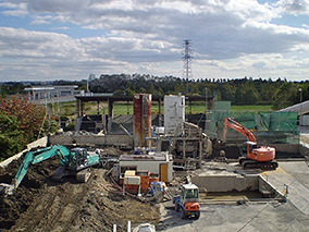 建設汚泥などの再資源化(造粒固化)施設。建設工事などで発生する無機性汚泥(産業廃棄物)に特殊固化材を添加し、短時間に再利用可能な造粒物に処理するシステム。