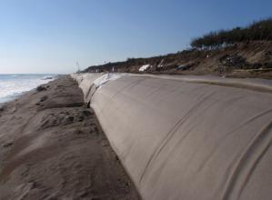 波による砂浜の侵食や浜崖の後退を防止または抑止するための技術において、繊維製の大型袋材に現地の海浜材料や養浜材を充填したサンドパック(砂袋詰め)工で、高強度のポリプロピレン製織布を基布としたチュ...