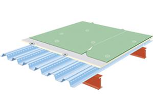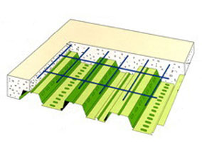 デッキプレートの表面にエンボスが施されており、コンクリートとデッキプレート双方の特長を効果的に発揮する合成スラブ構造。工程の省略・減少を可能にし、コストダウンが図れる。