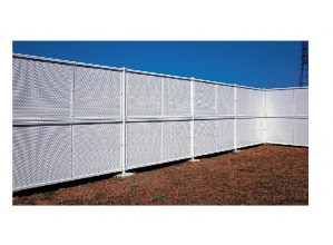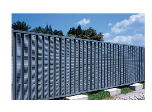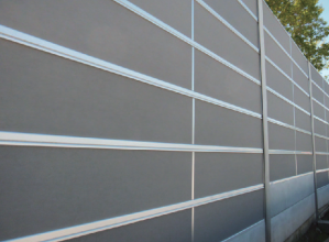 遮音タイプの目かくしフェンス。金属と樹脂のサンドイッチ構造により、同一重量で比較した場合、金属単体よりも遮音性に優れている。