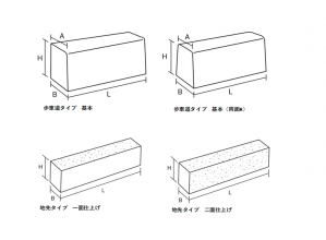 歩道と車道、緑地やステップなどの境界線をはっきりと作るだけでなく、地先タイプ、歩車道タイプ共に美しい景観も作り出す。 種石 白ミカゲ、稲田ミカゲ、錆ミカゲ、金華、稲荷、大磯、松葉