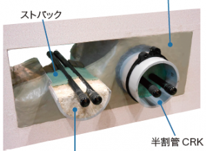 リサイクル樹脂(再生PP、PE)を主材料としたケーブルトラフ。従来のトラフと違い、二重構造の内管(VU)収納型としたことで、防鼠対策機能を付加し、ケーブルを小動物から守ることができる。