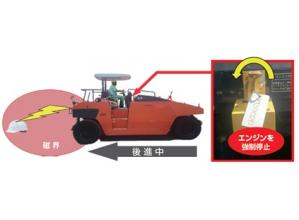 タイヤローラの後退方向に作業員が接近した場合、RFIDで侵入を検知しタイヤローラを自動停止する安全装置。
