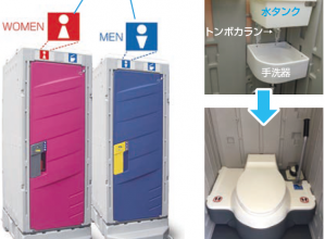 手を洗った排水を便器洗浄に再使用(リユース)する簡易水洗式の仮設トイレ。