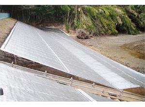 この工法は、大型の重機などを使用せずに、パネルを人力運搬-敷均-接着工程により短期間に水密性の高い防水層を作ることが可能である。パネル自体のタワミ性が大きいため、基盤沈下が予想される所でも使用で...