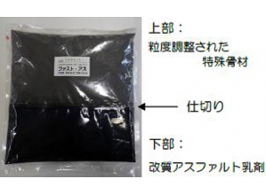 植物性特殊添加剤配合の改質アスファルトを用いた常温補修用混合物で、路面湿潤状態でも施工が可能。施工性・耐久性の向上や保管期間の延長が期待できる。