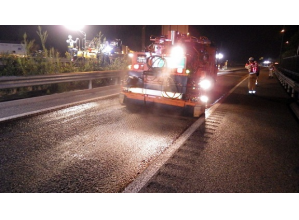 アスファルト乳剤と分解剤を特殊ディストリビュータで散布し、従来のタックコートの分解時間を最大1/10に短縮する技術