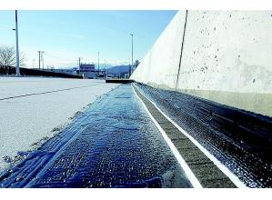 ・アスファルト舗装と地覆部との境界面から侵入する雨水によって生じる橋面防水層上の滞水について、橋面防水層に設置したテープ上の排水装置を用いて排水し、道路橋床版への浸水を防ぐことで耐久性向上を図る技術